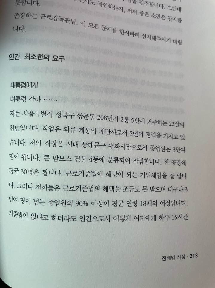 전태일이 당시 대통령에게 쓰려고 했던 편지 이지만 끝내 붙이지는 않았다고 하네요